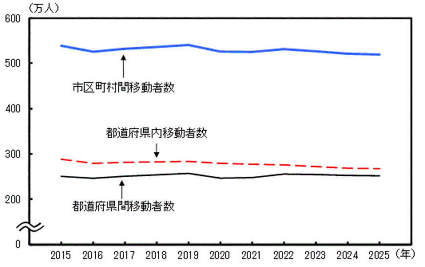 - 2025年の国内における市区町村間移動者数は519万548人となり、前年に比べ0.3%の減少
