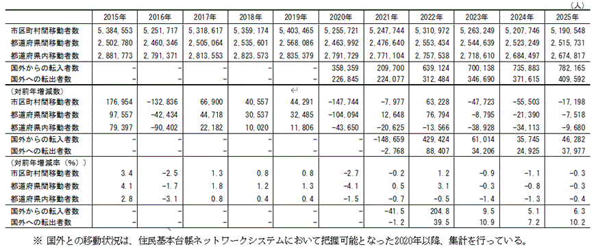 表1 国内の移動者数及び国外との移動状況の推移(2015年〜2025年)