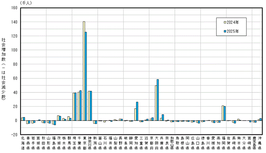 社会増減数=(転入者数−転出者数)+(国外からの転入者数−国外への転出者数)+移動前の住所地不詳 −職権消除等 - 都道府県別にみると、社会増加となっているのは東京都(12万5457人)、大阪府(5万8524人)、千葉県(4万2629人)など23都道府県
