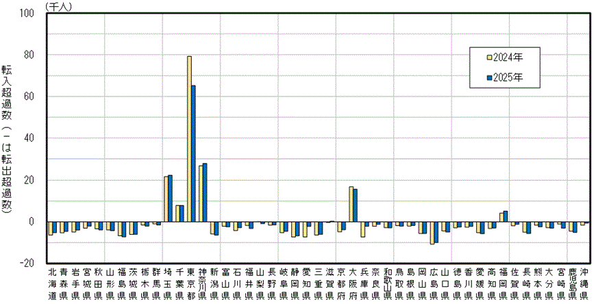 - 転入超過数は東京都が6万5219人と最も多く、神奈川県が最も拡大(1089人)