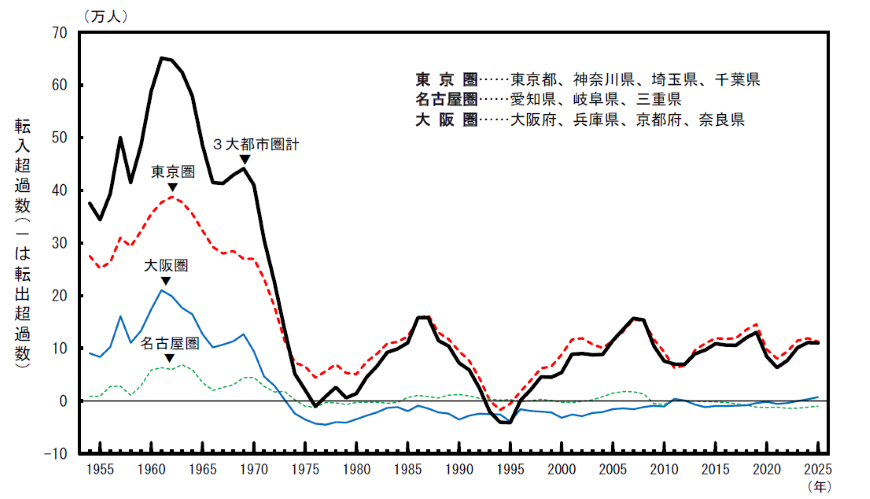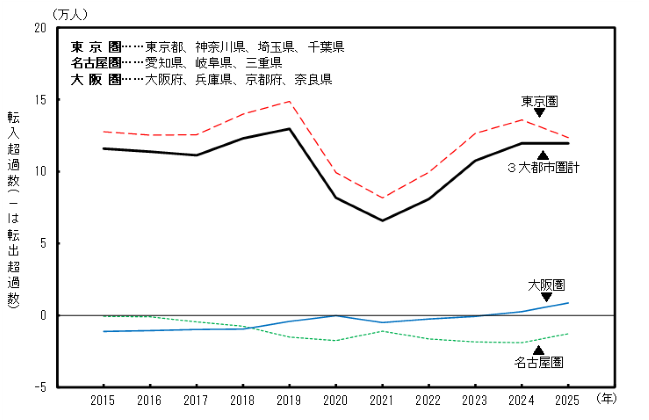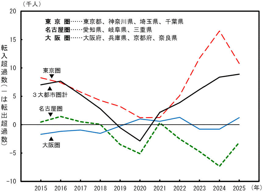 東京圏は30年連続、大阪圏は3年連続の転入超過、名古屋圏は13年連続の転出超過
