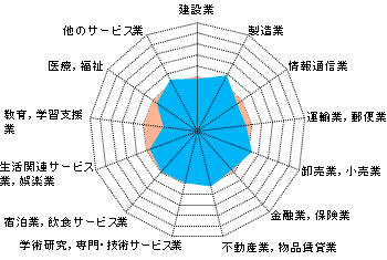 12大都市の産業別従業者数の構成比の特化係数は表2−2のとおりです。またこれをレーダーチャートにグラフ化したものが、図2になります。