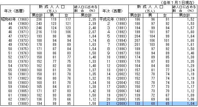 この1年間(平成20年1月〜12月)に,新たに成人に達した人口(平成21年1月1日現在20歳の人口)は133万人となっています。