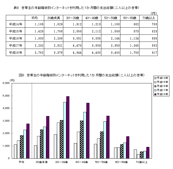 二人以上の世帯について,インターネットを利用した1か月間の支出総額を世帯主の年齢階級別にみると,30〜39歳の世帯が4,944円と最も高く,次いで40〜49歳が4,430円,50〜59歳が3,400円の順となっており,70歳以上が917円と最も低くなっている。これを前年と比べると,すべての年齢階級で増加している。(表8,図8)