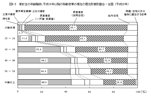 現在の居住形態別割合を家計主の年齢階級別にみると,「25歳未満」,「25〜29歳」及び「30〜39歳」はいずれも「民営借家(共同住宅)」が,「40〜49歳」,「50〜59歳」及び「60歳以上」はいずれも「持ち家」がそれぞれ最も高い割合となっている。