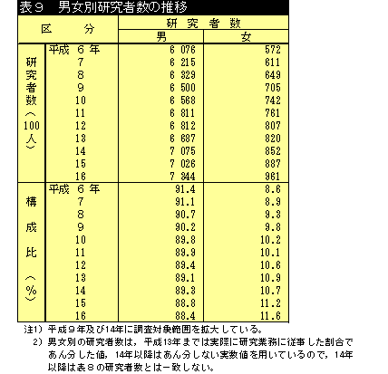 平成16年3月31日現在の研究者数を男女別にみると,男性が73万4400人(研究者全体に占める割合88.4%),女性が9万6100人(同 11.6%)となっており,女性研究者の占める割合は過去最高となっている。
