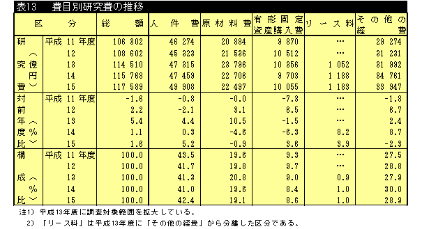 平成15年度の研究費を費目別にみると,人件費が7兆6314億円(研究費全体に占める割合45.4%),原材料費が2兆7856億円(同16.6%),有形固定資産購入費が1兆7376億円(同10.3%),リース料が1808億円(同1.1%),その他の経費が4兆4688億円(同26.6%)となっている。