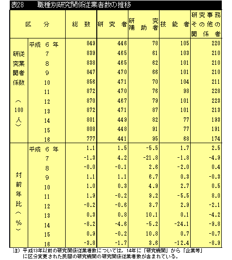 平成16年3月31日現在の研究関係従業者数は7万7700人で,前年に比べ3.8%減となっている。