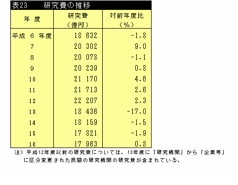なお,賃金水準等物価の変動分を除去して算出した実質研究費(平成12年度基準)は17兆6154億円で,前年度に比べ0.4%増となっている。