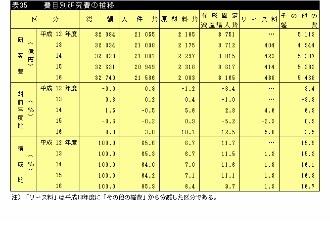 平成16年度の研究費を費目別にみると,人件費が7兆6115億円(研究費全体に占める割合44.9%),原材料費が2兆8169億円(同16.6%),有形固定資産購入費が1兆5627億円(同9.2%),リース料が1784億円(同1.1%)などとなっている。