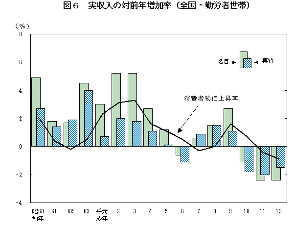 最近の動きをみると,平成6年に実質(-)1.1%の減少と昭和55年(実質-0.6%)以来14年ぶりの実質減少となった後,7年は実質(+)0.9%,8年は実質(+)1.5%,9年は実質(+)1.1%と3年連続の実質増加となった。平成10年は景気低迷により世帯主の臨時収入・賞与が大幅な減少となったほか,所定外労働時間の減少を反映して世帯主の定期収入が減少したことなどから実質(-)1.8%の減少となり,11年も世帯主の定期収入及び臨時収入・賞与の減少が続いた。平成12年は生産の回復による所定外労働時間の増加を反映して世帯主の定期収入が増加に転じたものの,世帯主の臨時収入・賞与が大幅な減少となったことなどから実質(-)1.5%の減少となった(図6,表3)。