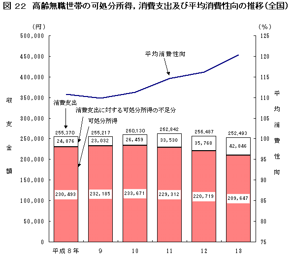 また,消費支出に対する可処分所得の不足分(42,846円)は,前年(35,768円)に比べ拡大した。可処分所得の不足分は,個人・企業年金保険の受け取り(14,588円)を始め,金融資産の取り崩しなどで賄われている(図22,表15)。