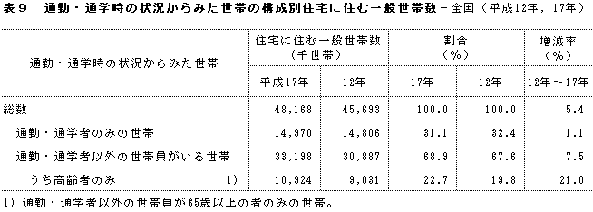 - 住宅に住む一般世帯(4817万世帯)について,通勤・通学時の状況からみた世帯の構成をみると,「通勤・通学者のみの世帯」は1497万世帯(住宅に住む一般世帯の31.1%)となっている。一方,通勤・通学者以外の世帯員がいる世帯は3320万世帯(同68.9%)で,このうち65歳以上の「高齢者のみ」の世帯は1092万世帯(同22.7%)となっている。(表9)