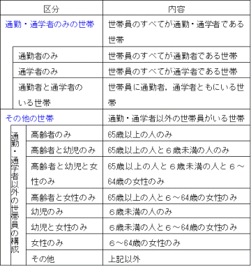 「従業・通学時の世帯の状況」は,一般世帯について,その世帯員の従業・通学の状況により区分したもので,昭和60年調査から設けています。この分類では,一般世帯を「通勤・通学者のみの世帯」と「その他の世帯」に区分し,さらに,「通勤・通学者のみの世帯」については通勤者か通学者かにより,また,「その他の世帯」については,通勤・通学者が勤務先・通学先に出かけた後,その世帯に残る世帯員の構成により,次のとおり区分しています。