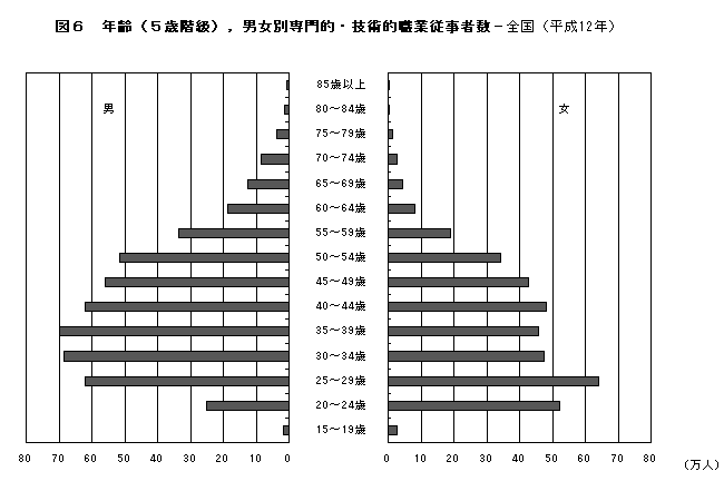次いで増加数の多かった「専門的・技術的職業従事者」は,平均年齢が最も若い(40.6歳)職業であり,男女とも20歳台と30歳台の合計が就業者の約半数を占めている。