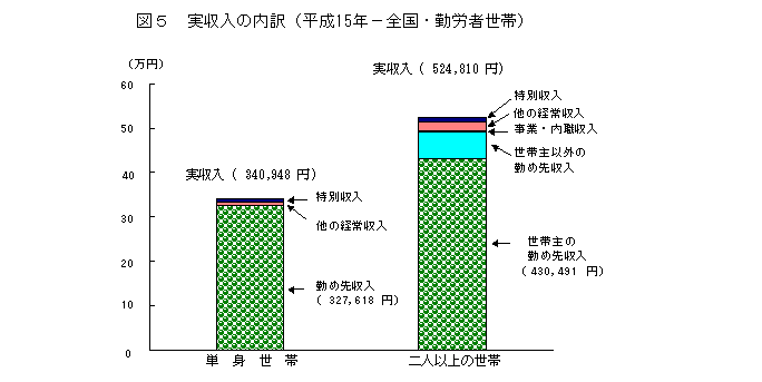 平成15年の単身の勤労者世帯の1か月平均実収入(340,948円)は,二人以上の世帯の勤労者世帯(世帯主の平均年齢46.4歳)の1世帯当たり1か月平均実収入(524, 810円) の0.65倍となっている。