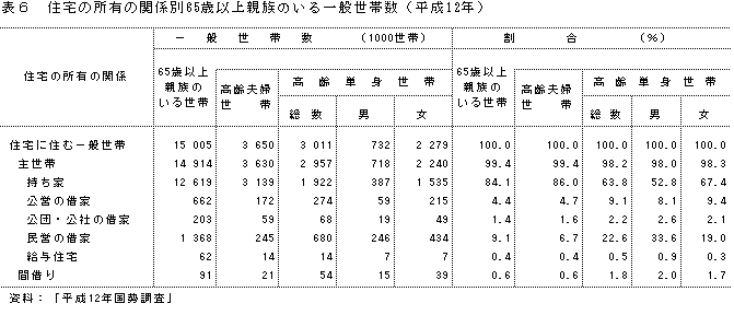 高齢夫婦世帯(夫65歳以上,妻が60歳以上の夫婦のみの世帯)についてもほぼ同様で,持ち家が86.0%,民営の借家が6.7%となっているが,高齢単身世帯(65歳以上の単独世帯)では持ち家の割合が63.8%と低く,民営の借家の割合が22.6%と高くなっている。中でも,男性の高齢単身世帯では,民営の借家の割合が33.6%と3割を超えている。(表6)