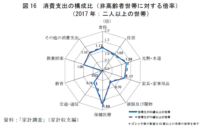 世帯主が65歳以上である二人以上の世帯(高齢者世帯)について、2017年の消費支出の10大費目別構成比を世帯主が65歳未満の世帯(非高齢者世帯)と比較すると、「保健医療」が1.69倍と最も高くなっています。内訳をみると、「健康保持用摂取品」が2.33倍と高くなっており、健康の維持・増進のため保健医療に費やす支出割合が高いという特徴がうかがえます。次いで「光熱・水道」が1.26倍、「食料」及び「家具・家事用品」が1.17倍などとなっています。(図16、表5)