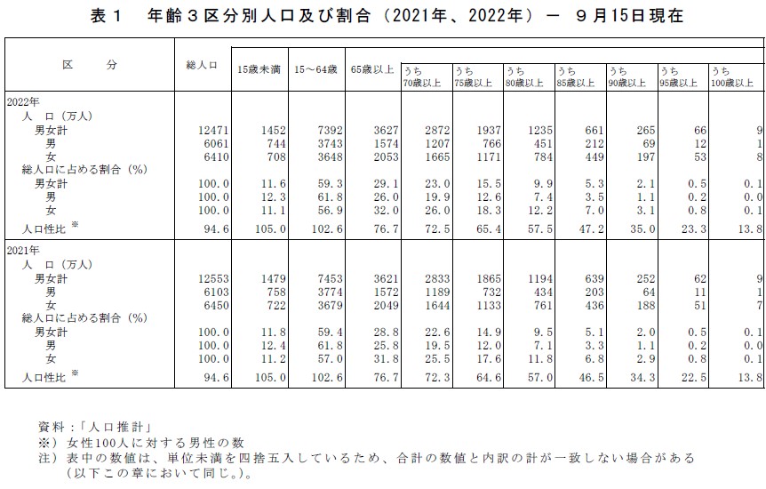 我が国の総人口(2022年9月15日現在推計)は、前年に比べ82万人減少している一方、65歳以上の高齢者(以下「高齢者」といいます。)人口は、3627万人と、前年(3621万人)に比べ6万人増加し、過去最多となりました。総人口に占める割合は29.1%と、前年(28.8%)に比べ0.3ポイント上昇し、過去最高となりました。