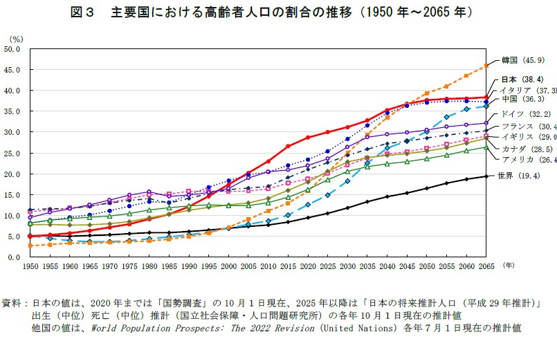 主要国における高齢者人口の割合の推移をみると、各国とも上昇傾向となっています。 (図3)