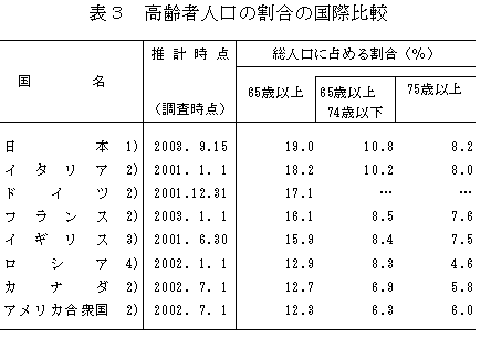 - 平成15年9月15日現在における我が国の65歳以上人口(推計)は2431万人で、総人口の19.0%を占め、人口、その割合とも過去最高となった。