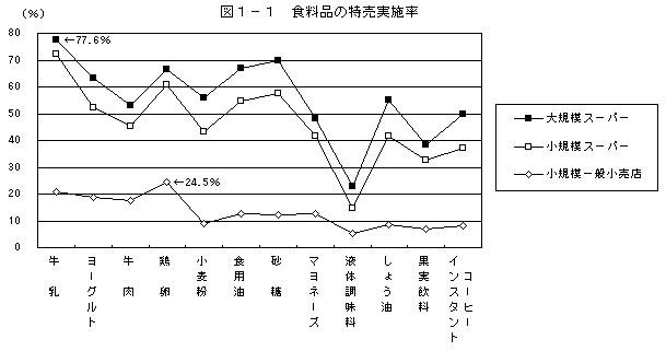 - 特売実施率は、大規模スーパーで高く、小規模一般小売店では低い傾向にある。