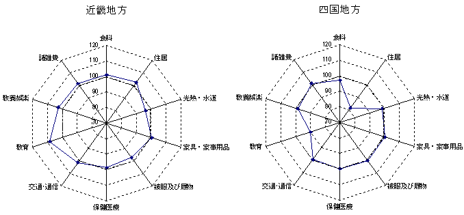 これに対し、四国地方では、多くの分類で全国平均程度であるが、「住居」(81.6)と「教育」(89.9)が全国平均より大幅に低くなっている。