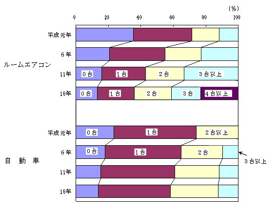 図I-4 ルームエアコン及び自動車の所有台数別世帯割合の推移 〜二人以上の世帯〜