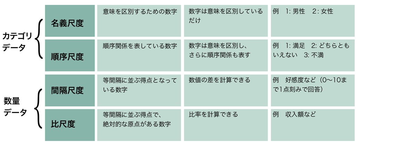 - データファイルに入力された数値は、情報の種類により4つの尺度水準に分けられる。