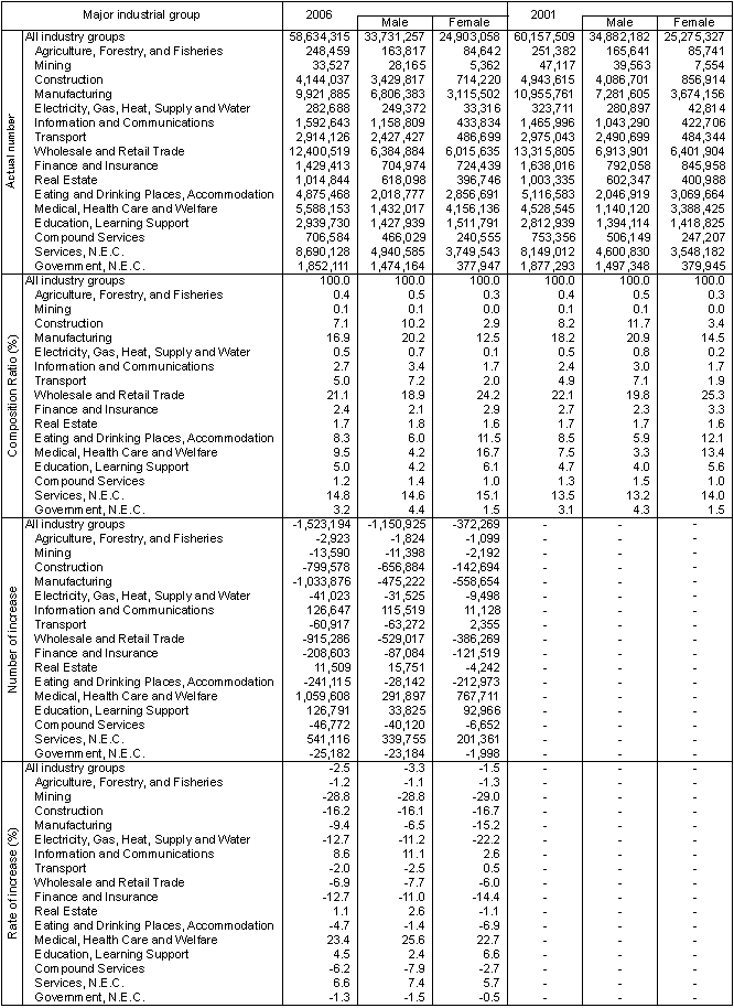 Compared with 2001 main industries, the number of persons engaged increased in "Medical, Health Care and Welfare" by 23.4 %, "Services, N.E.C." by 6.6 % and others, while it decreased in "Construction" by 16.2 %, "Manufacturing" by 9.4 % and others.