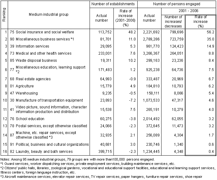 Among medium groups with more than 100,000 persons engaged whose number of establishments increased compared with 2001, the rate of increase was the highest in "Social insurance and social welfare" at 48.2 %, followed by "Miscellaneous business services" including guard services and worker dispatching services at 11.0 %, "Waste disposal business" at 10.2 %, and so on (Table I-8).