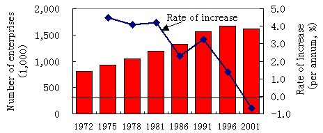 The number of enterprises continued to increase until 1996, and it fell in the period from 1996 to 2001 for the first time.