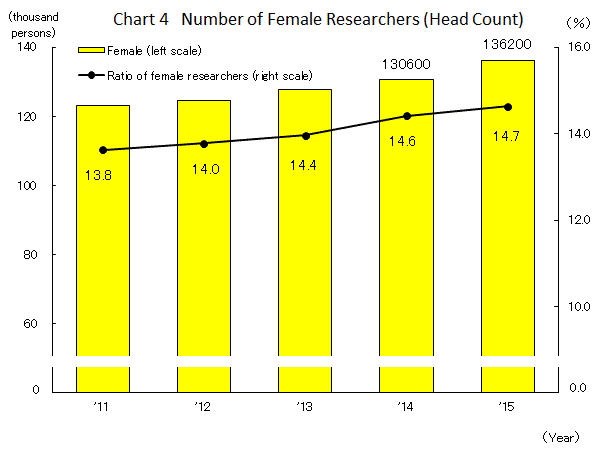 The number of female researchers is 136,200 and accounts for 14.7 percent of the total researchers. Both of figures reached the largest in the past years.