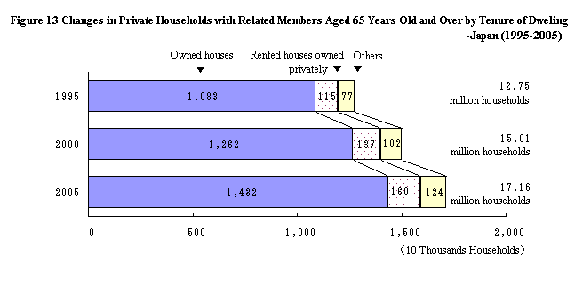 - The number of private households with related members aged 65 years old and over living in owned houses had increased by 1,701,313 households, or 13.5%, from 2000. By type of family, 2,495,278 households were formed by aged-single-persons, increased 573,579 households (29.8%) from 2000. In addition, a total of 3,866,044 aged-couple households, increased of 726,903 households, or 23.2%, from 2000. (Fig. 13)