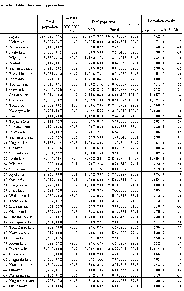 Main contents start here First basic statistical results: Summary of results - Prefectures Key Indicators (2005) ? Attached Table 1 Indicators of Japan Attached Table 3 Population by Age (Single Years) and Sex ? Top of this page