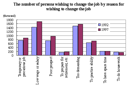 - The most common reason, totaling 1,714,000 cases, for wanting to change job was "low salary", followed by 1,581,000 cases of "too demanding". The greatest increase since 1992 was 282,000 cases of "low salary", followed by 220,000 instances of "poor prospect".