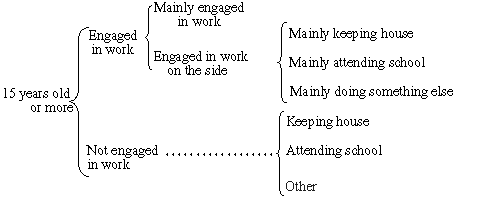 Persons who are usually working for financial reward and intend to continue working after the survey date (October 1, 2002), and those who have jobs but are absent from work at present. Family workers who as a matter of course are working are considered persons with jobs even if they work without pay. |