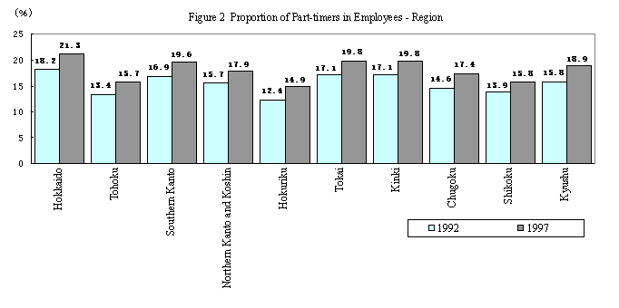 By district, at 21.3%, Hokkaido has the highest rate of part-time and side work, followed by Tokai and Kinki (19.8%), Southern Kanto (19.6%), and Kyushu (18.9%). The figures rose in each district since 1992, including a 3.1-point rise in Hokkaido and Kyushu, and a 2.8-point rise Chugoku (Fig. 2).