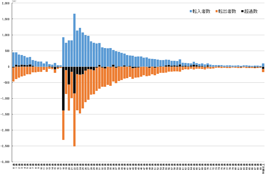 基本集計結果で加齢とともに減少が見られた20歳以上の移動者数については、加齢とともに単純に減少しているのではなく、退職など、いわば人生の節目の年齢と考えられる「60歳」及び「65歳」において、前後の年齢に比べて移動者数が多くなる事象が見られます。また、子供の年齢層で見られる加齢に伴う移動者数の減少傾向は17歳まで続いており、小学校の入学年齢である「6歳」、中学校の入学年齢である「12歳」、高校の入学年齢である「15歳」で、前後の年齢と比べて移動者数が多くなっています。こうしたライフイベントをもたらす年齢で移動者数が特異的に多くなる現象は、上述の「22歳」(大学の卒業年齢に相当)や「24歳」(大学院の修士課程修了年齢に相当)のほか、専門学校・短大の卒業年齢に当たる「20歳」及び大学等の入学年齢に相当する「18歳」でも見られます。