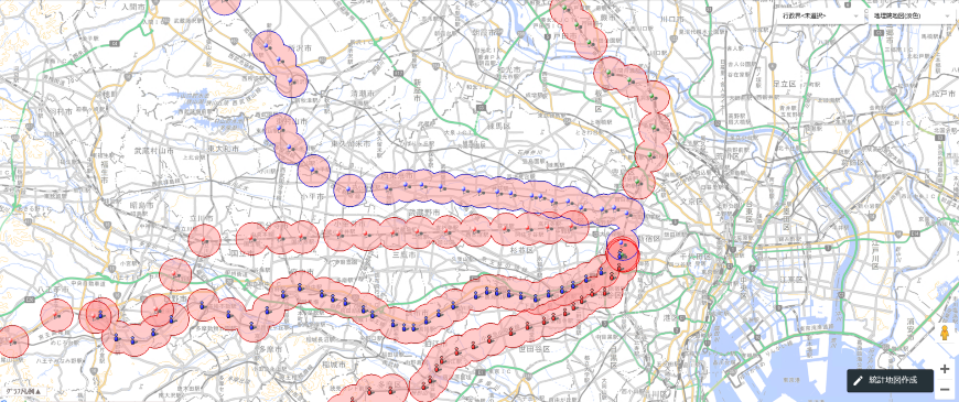 統計局では、地理情報システム(GIS)の仕組みを活用し、利用者の個々のニーズに合わせて、国勢調査及び経済センサスを始めとした統計データを背景地図と共に視覚化するシステムである「統計GIS」を提供しています。このシステムを用いて統計地図を作成することにより、統計表を眺めただけでは困難な地理的分析を視覚的に行うことができます。なお、このシステムは政府統計の総合窓口「e-Stat」から誰でも無償で使用することができます。今回の分析では、この統計GISを用いて、駅から一定の距離内のエリアを構築し、そのエリア内の事業所の数や従業者の数を産業別に推定することを行っています。