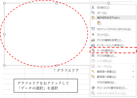 「挿入」から散布図(線付き)を選択すると、グラフエリアが表示されますので右クリックして「データの選択」を選びます。