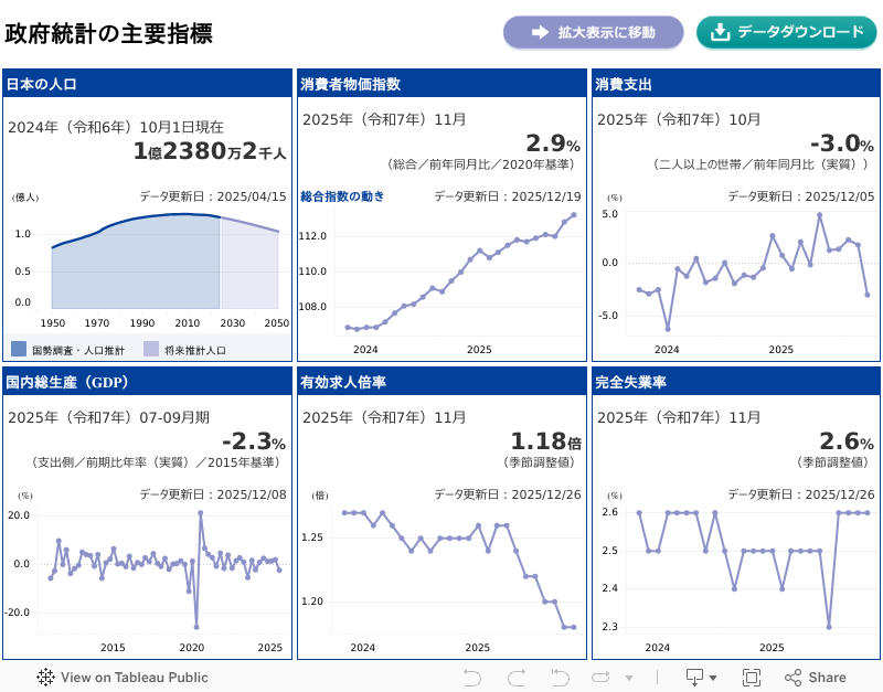 主要指標 こちらのデータは、TableauPublicを利用して表示しております。Tableauのプライバシーポリシーをご覧ください。 統計調査別ダッシュボード 人口・世帯 国勢調査(人口と世帯) 人口推計(人口の推移) 住民基本台帳人口移動報告(人口移動) 住宅・土地統計調査(住宅数と空き家率) 家計・物価 家計調査(消費支出) 家計消費状況調査(ネットショッピングの状況) 全国家計構造調査(消費支出) 小売物価統計調査(消費者物価地域差指数) 消費者物価指数 (CPI) 就業・労働 労働力調査(完全失業率) 就業構造基本調査(有業率) 社会生活基本調査(生活時間) 産業・経済 経済センサス-活動調査(産業別売上高・事業所数) 経済構造実態調査(産業別売上高) 科学技術研究調査(研究費・研究者数) 個人企業経済調査(個人企業売上高) サービス産業動向調査(サービス産業売上高)